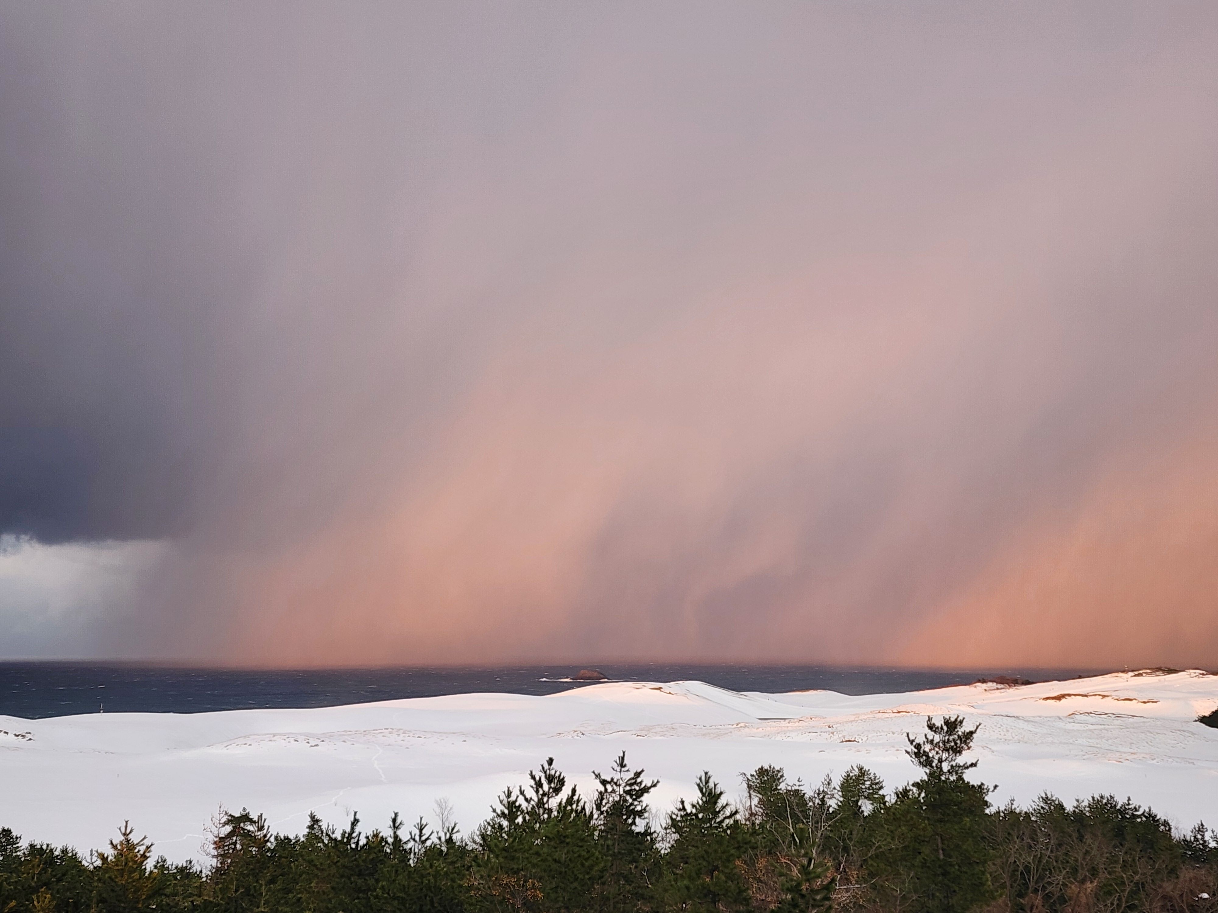 大雪が降る前の24日の夕方には、西の空の雪雲の切れ間から日が差し砂丘がくっきり浮かび上がり、その直後には夕日に照らされた雪雲が赤く染まりました。